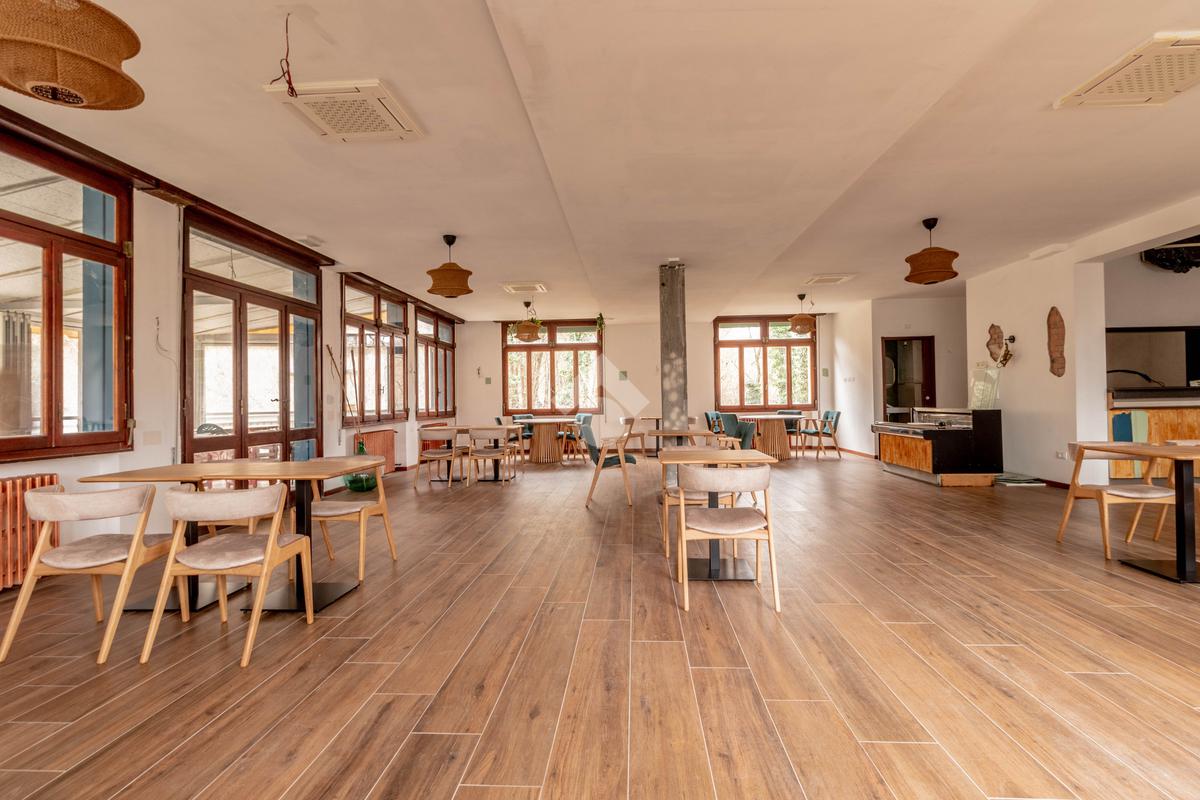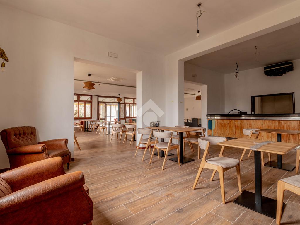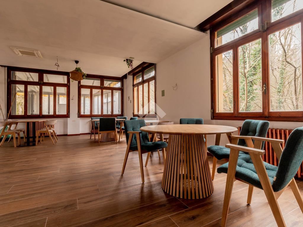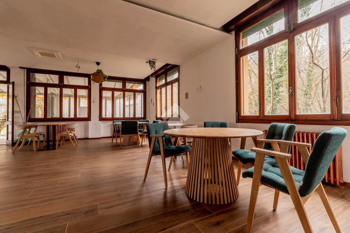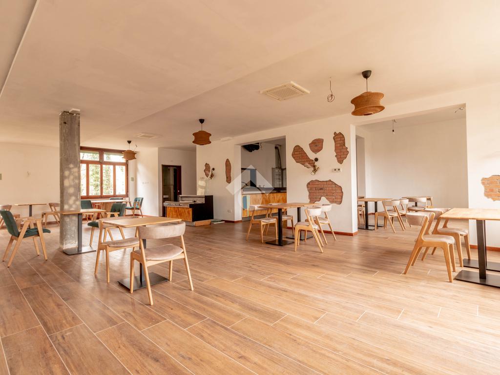 I locali prevedeno grande sala, veranda con affaccio sul verde, zona bar e cucine oltre ai bagni.